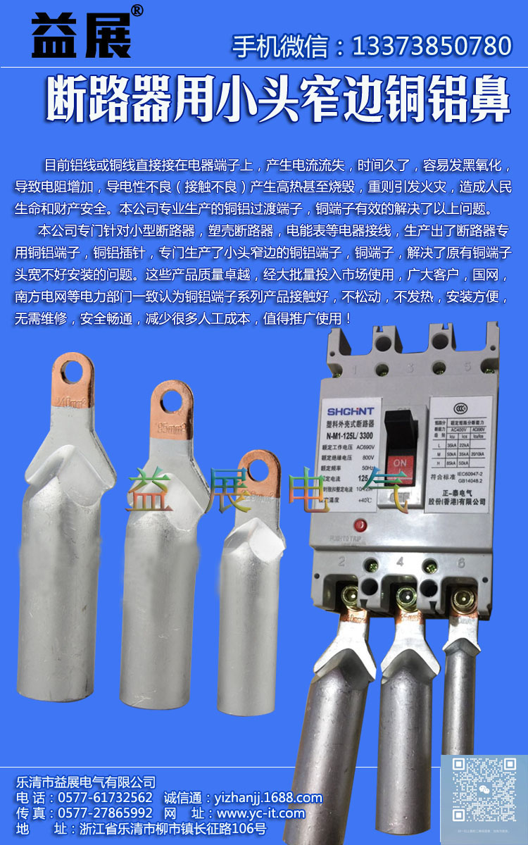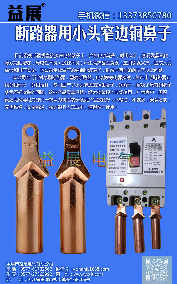 斷路器專用銅鼻子,DTX-35鍍錫銅鼻子,窄頭銅鋁線鼻子,益展電氣專業生產各種銅鼻子,雙孔銅鼻子,銅鋁過渡線鼻子,SC窺口線鼻子,雙孔銅鋁鼻子,冷熱縮電纜附件,穿刺線夾,堵油銅鼻子,冷壓端子,C45插針,OT開口鼻子,管型冷壓端頭,銅鋁線夾,接線端子,接插件,壓線帽,等各系列配線器材。廠家直銷,價格優,質量高。歡迎與各界人士合作。